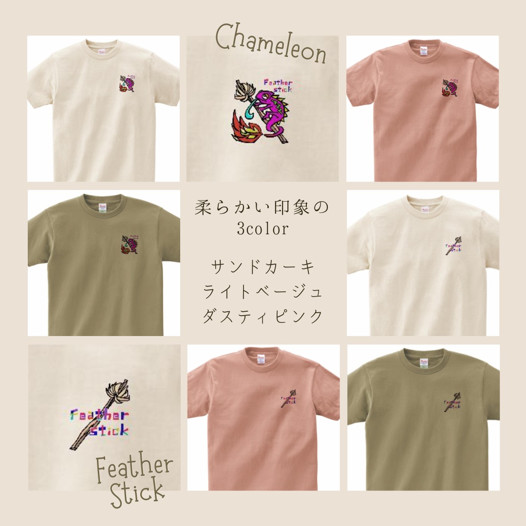 スモーキーカラーでナチュラルな印象のTシャツを、定番カメレオンデザインと新たなフェザースティックデザインの2種類ご用意しました。